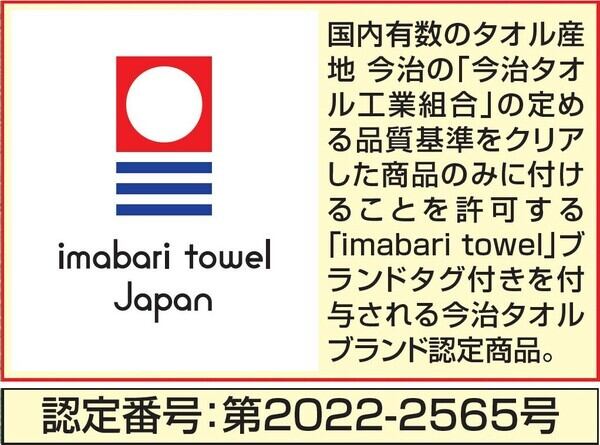 ●国内有数のタオル産地 今治の「今治タオル工業組合」の定める品質基準をクリアした商品のみに付けることを許可する「imabari towel」ブランドタグ付きを付与される今治タオルブランド認定商品。認定番号:第2022-2565号